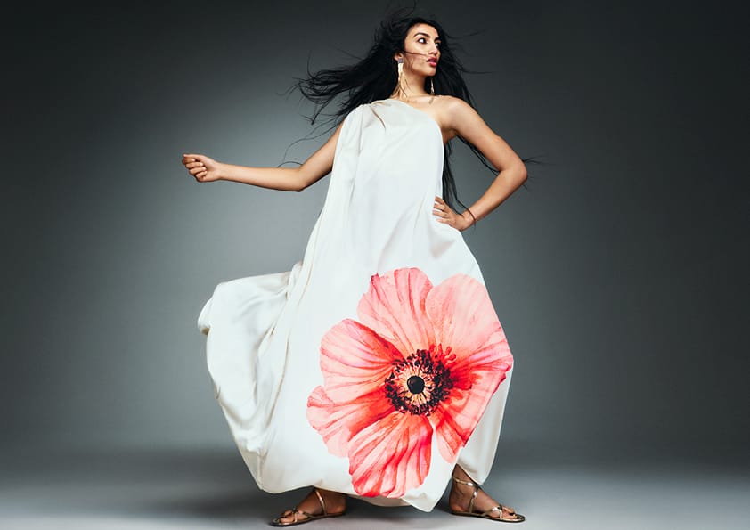 2. The women’s collection features bold silhouettes and luxurious fabrics in festive colors.
